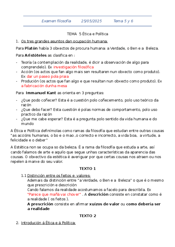 Los Tres Grandes Asuntos de la Ocupación Humana (Según Platón, Aristóteles y Kant). Distinción entre Hechos y Valores (Descripción vs. Prescripción). Introducción a la Ética y a la Política: Moral, Ley, Ética y Política: Distinción de Niveles Normati