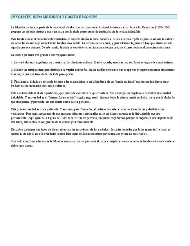 Apuntes de René Descartes para la preparación de los Exámenes de Acceso a la Universidad. Bien resumidos y esquematizados, con todos los contenidos necesarios para superar la asignatura de Hª de la Filosofía y su examen en la PAU