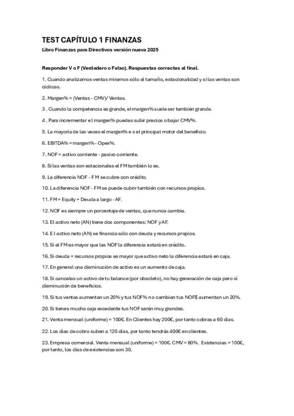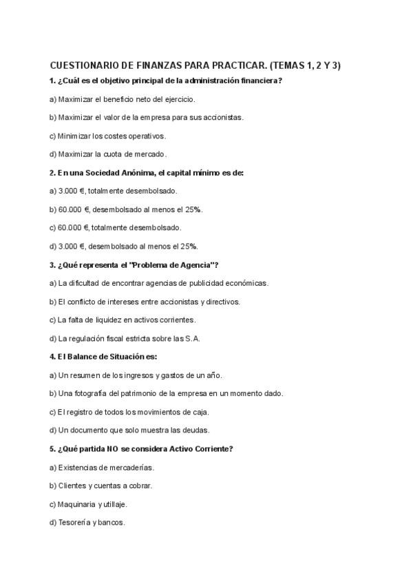 Test del cap. 1 de finanzas de la nueva edición del libro de finanzas para directivos