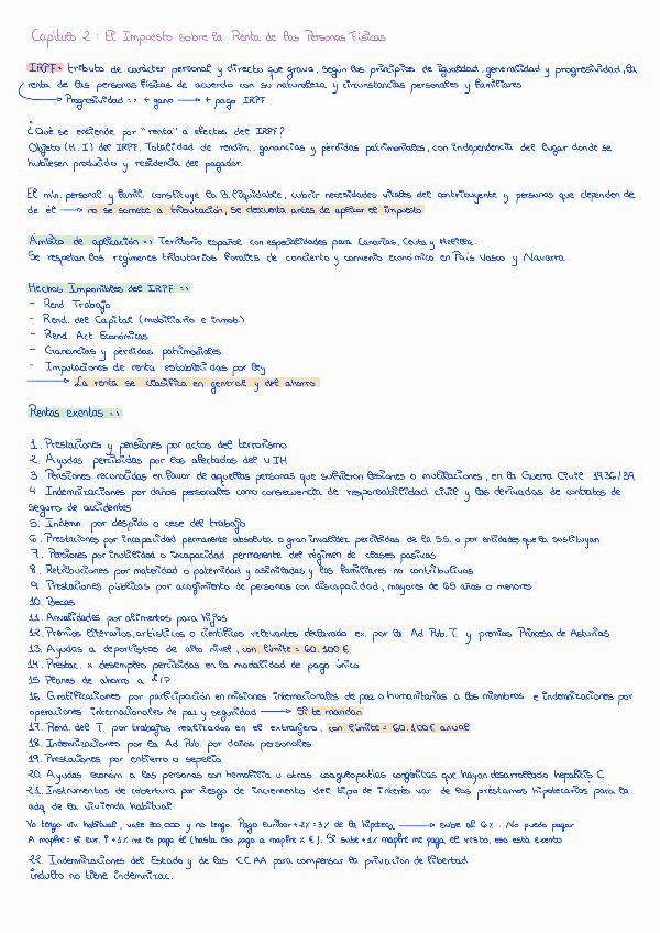 Apuntes del Capítulo 2: IRPF del manual, con las anotaciones y subrayado en clase de la profesora