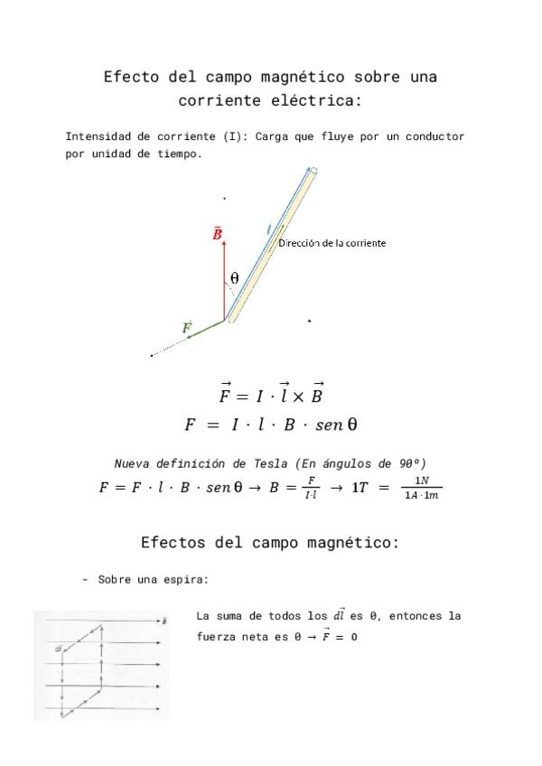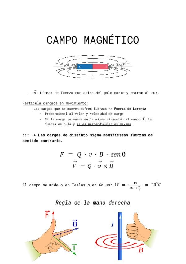 Esquema de todo el temario del campo magnético, resumido y bien explicado. Todos los contenidos incluidos, entre ellos: Ley de Lorentz, regla de la mano derecha, efecto del campo magnético sobre una corriente eléctrica, momento (momento magnético y par d