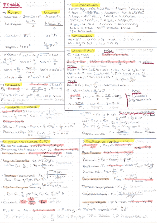Formulario completo para el examen final de Física. Las fórmulas subrayadas en rosa son las realmente importantes y que se utilizan en los ejercicios.