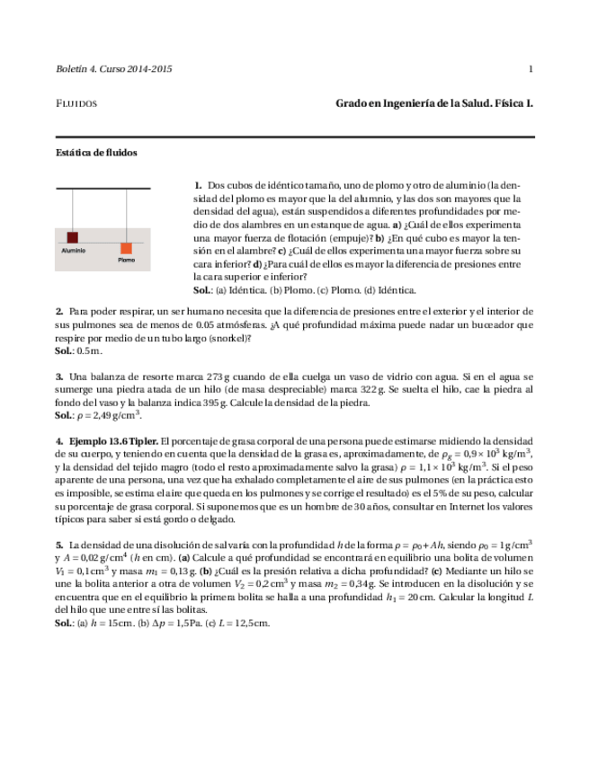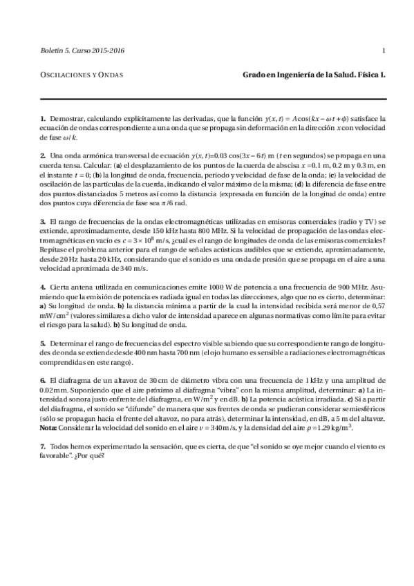 Boletines resueltos de los temas 1 (cinemática), 2 (dinámica), 3 (sistemas de partículas y sólido rígido), 4 (fluídos) y 5 (ondas).