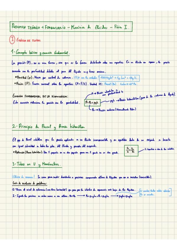 Apuntes y fórmulas para resolver problemas tanto de estática de fluidos como de dinámica de fluidos.
