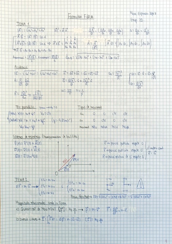 Apunts del tema 1 (CINEMÀTICA) de física I bastant reduïts, a una pàgina i mitja.