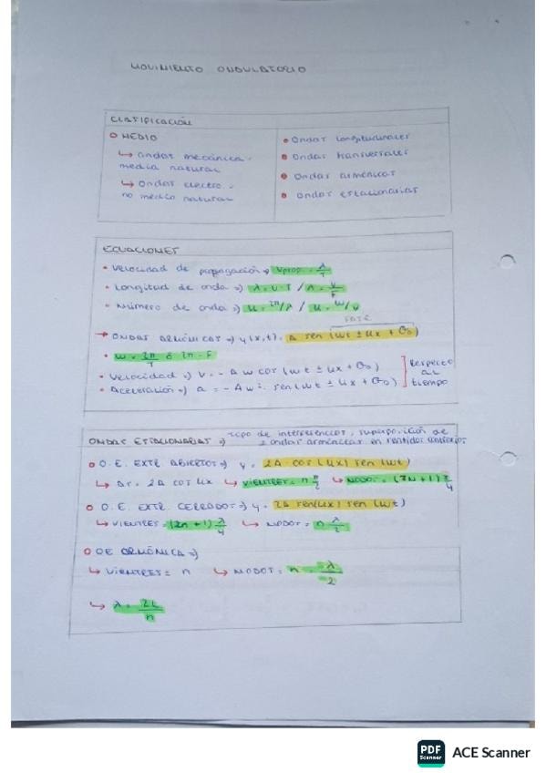 Apuntes del movimiento ondulatorio de 2º de bachillerato: Incluye Movimiento oscilatorio, tipos de ondas, ondas armónicas, energía del movimiento ondulatorio y ondas sonoras. Suerte!!