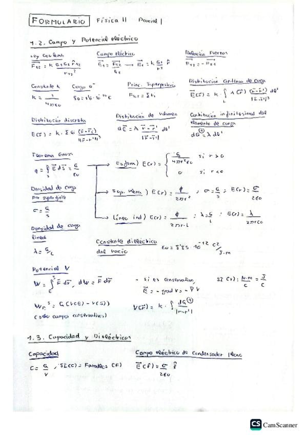 Formulario/resumen de contenidos con todas las fórmulas empleadas en los problemas del primer parcial de Física II