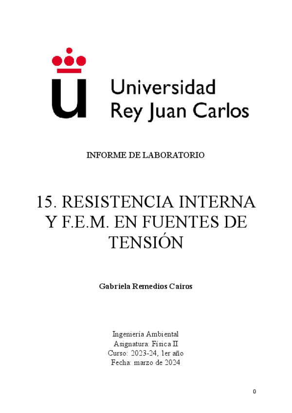 NOTA obtenida: 8'5. Informe de laboratorio del año 2023-2024 de Física II con el profesor Alvar. RESISTENCIA INTERNA Y F.E.M. EN FUENTES DE TENSIÓN.