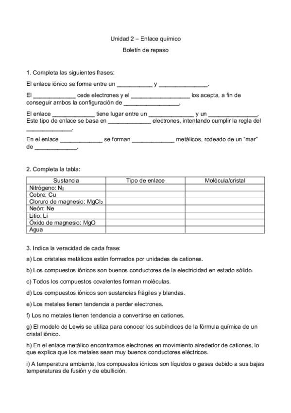 Apuntes y ejercicios sobre la estructura atómica y el enlace químico, temario de física y química de 1º de bachillerato.