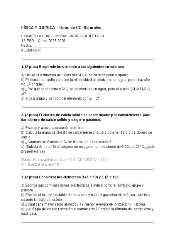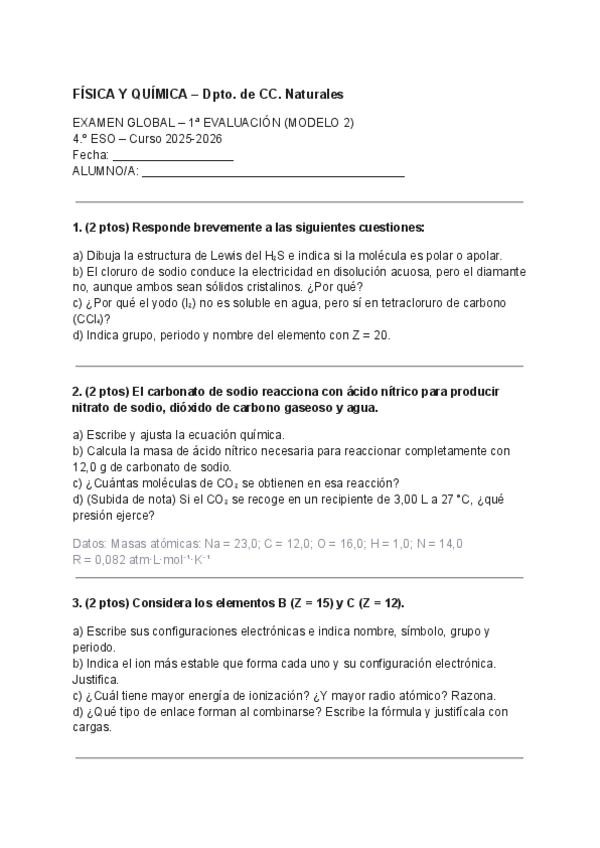 Examenes modelo del final de la asignatura de quimica de 4 eso.