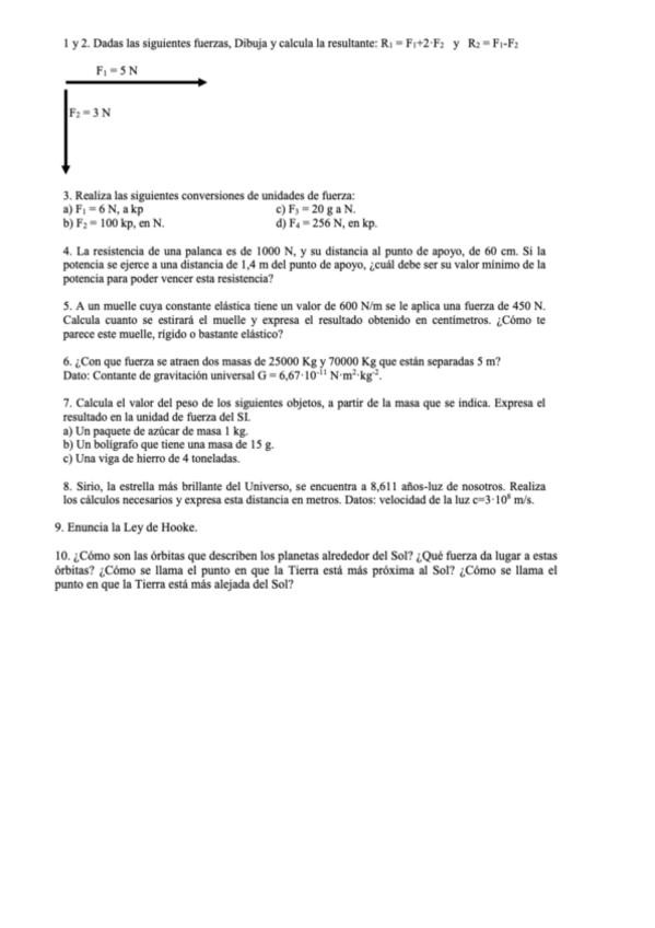 Problemas de dinámica en Física y Química 4º ESO con fuerzas, planos inclinados, rozamiento, poleas, palancas y muelles. Incluye aceleraciones, tensiones y equilibrio. Perfecto para practicar leyes de Newton, coeficiente de rozamiento, fuerza normal y sis