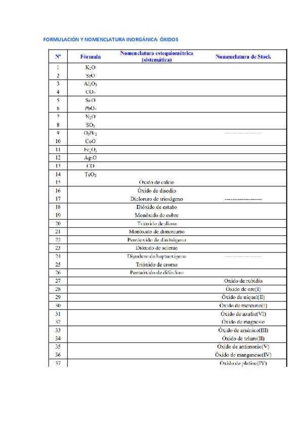 Ejercicios Química 2º ESO furmulación - ÓXIDOS