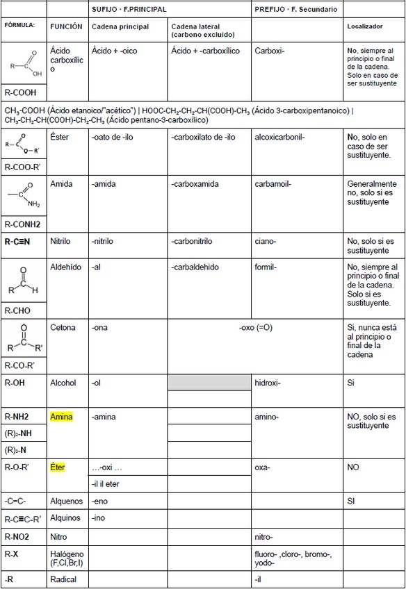 Tabla visual a una cara de todos los compuestos orgánicos de bachillerato, ordenados de mayor a menor prioridad funcional (arriba a abajo).