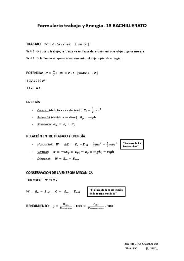 Formulario trabajo y energía. Física y química 1º Bachillerato