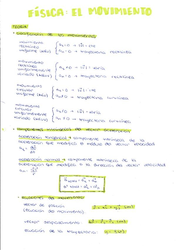 Apuntes sobre clasificación de movimientos, componentes intrínsecas de la aceleración y ecuaciones del movimiento. Ejercicio completo resuelto sobre las ecuaciones del movimiento.