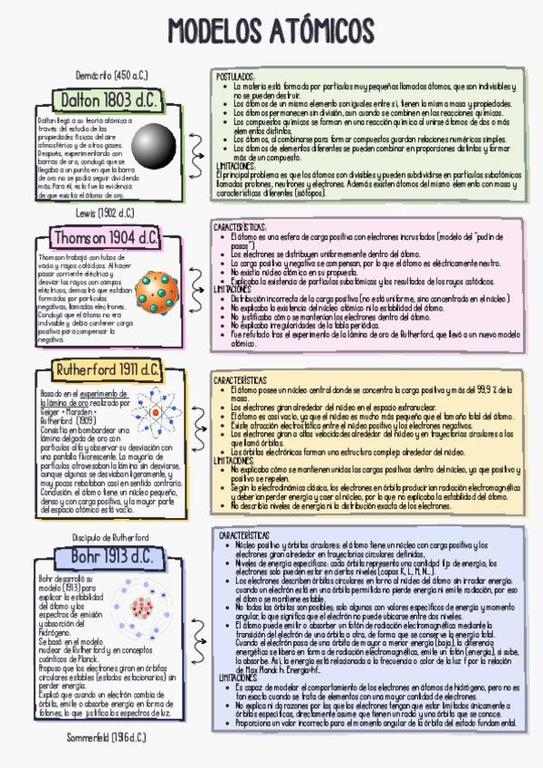 Línea del tiempo de los modelos atómicos: autor + investigación + postulados + limitaciones. Demócrito, Dalton, Lewis, Thomson , Rutherford, Bohr y Sommerfeld.