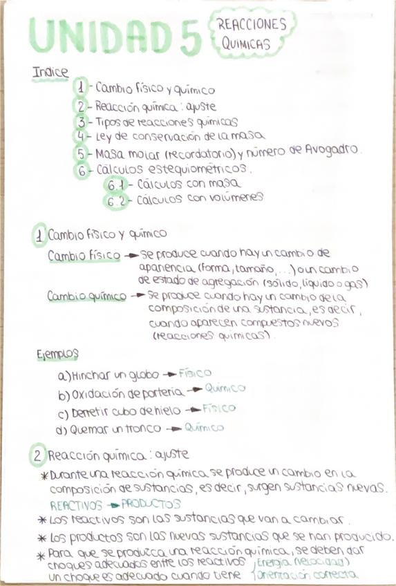 Resumen de las reacciones químicas. Incluye: -Cambios (Físicos y químicos) -Reacciones químicas -Teoría de las colisiones -Factores que influyen en la velocidad de las colisiones -Ley de conservación de la masa/Ley de Lavoisier -Reglas para ajustar las re