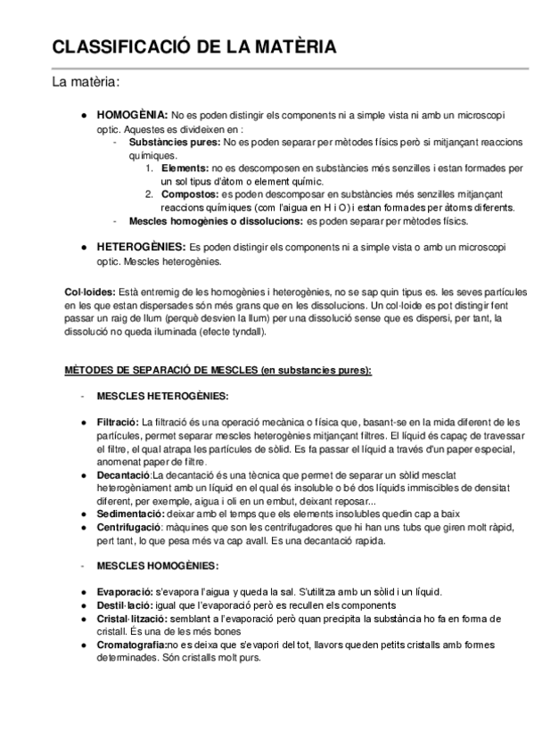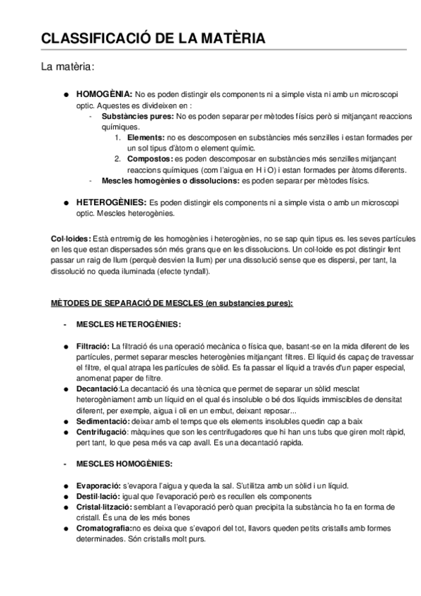 CLASSIFICACIÓ DE LA MATÈRIA, COMPOSICIÓ DE LES DISSOLUCIONS I DISPERSIONS COL·LOÏDALS