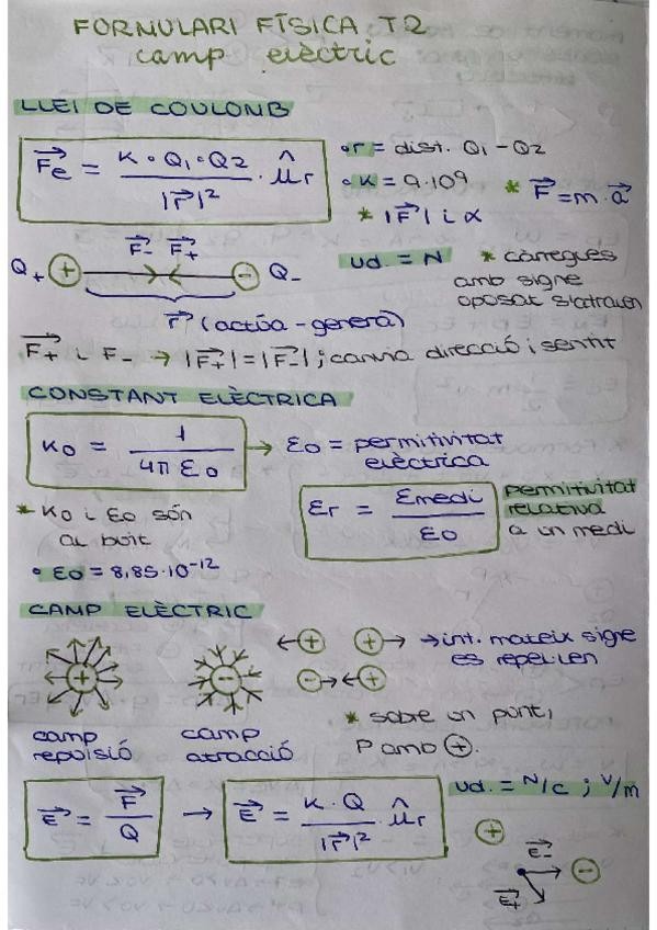 Formulari sintetitzat del tema 2 de física de 2BACH: Camp Elèctric.