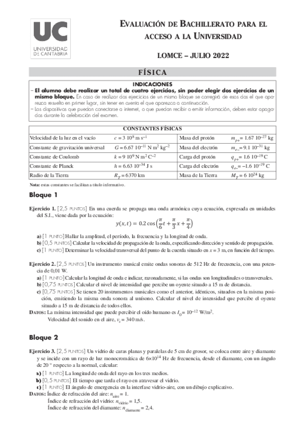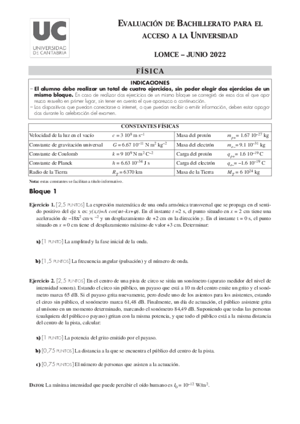 Exámenes Física EBAU 2022