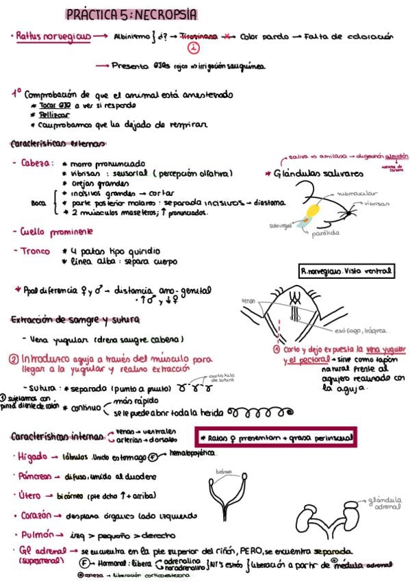 Apuntes de la práctica 5 (Necropsia) de la asignatura de Fisiología animal. Cuenta con esquemas e imágenes.