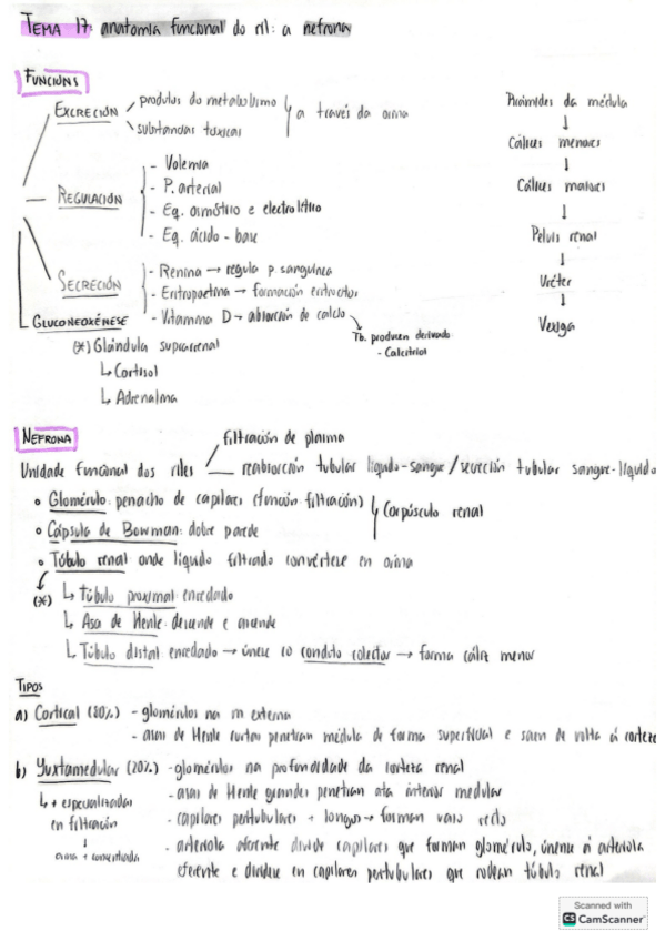 Esquema del tema 17 de fisiología humana de 1º de enfermería. Anatomía funcional del riñón. Bloque del sistema aparato urinario