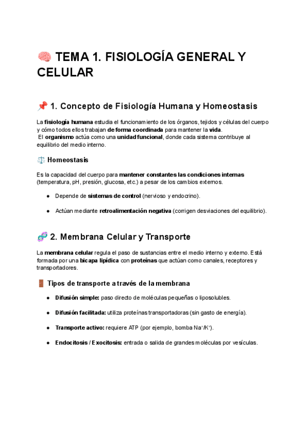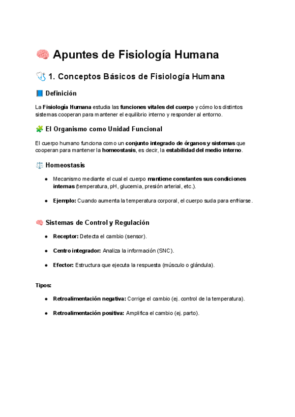 Apuntes completos sobre la fisiología general y celular: homeostasis, sistemas de control, membrana celular, sinapsis y contracción muscular. Explicaciones claras, esquemas y test de repaso para estudiar rápido.