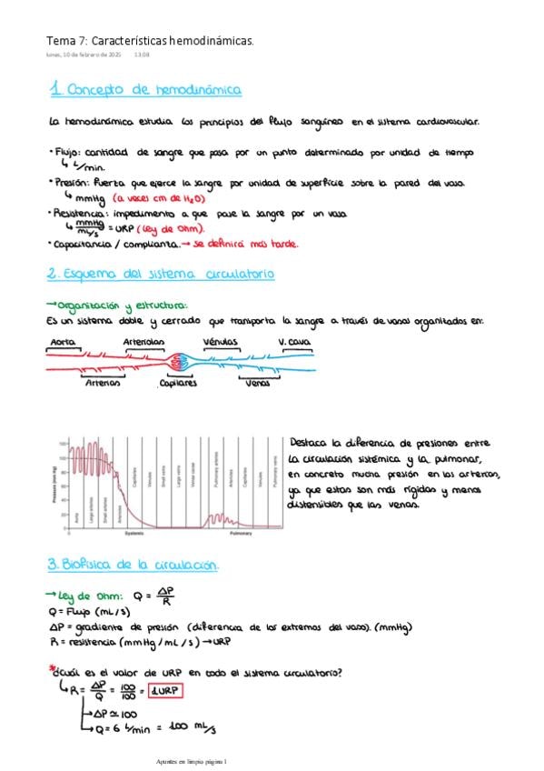 Folio de repaso de las fórmulas, ecuaciones, etc. con conceptos explicados del Tema 7 de Fisiología Médica I: Características hemodinámicas del sistema circulatorio.
