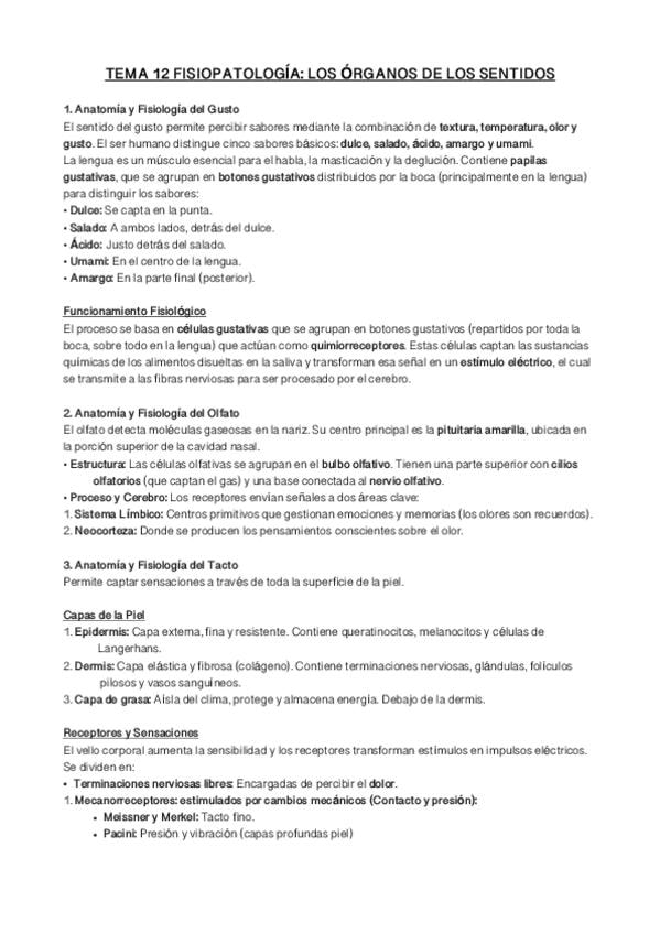 Resumen completo del Tema 10: Los órganos de los sentidos. Fisiopatología (1º Higiene Bucodental). Incluye esquemas claros, conceptos explicados y contenido enfocado a examen. Ideal para repasar rápido antes de la prueba.