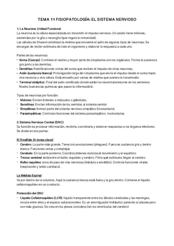 Resumen completo del Tema 9: El sistema nervioso. Fisiopatología (1º Higiene Bucodental). Incluye esquemas claros, conceptos explicados y contenido enfocado a examen. Ideal para repasar rápido antes de la prueba.