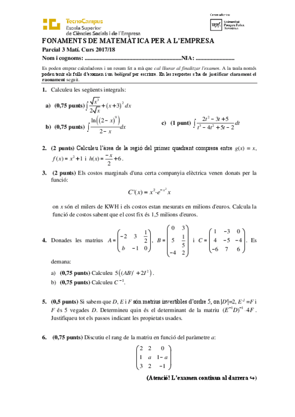 He publicado nuevos examenes de 1º Fonaments de Matemátiques per a L'empresa: Parcial 3 Matí