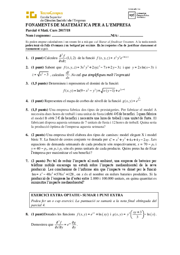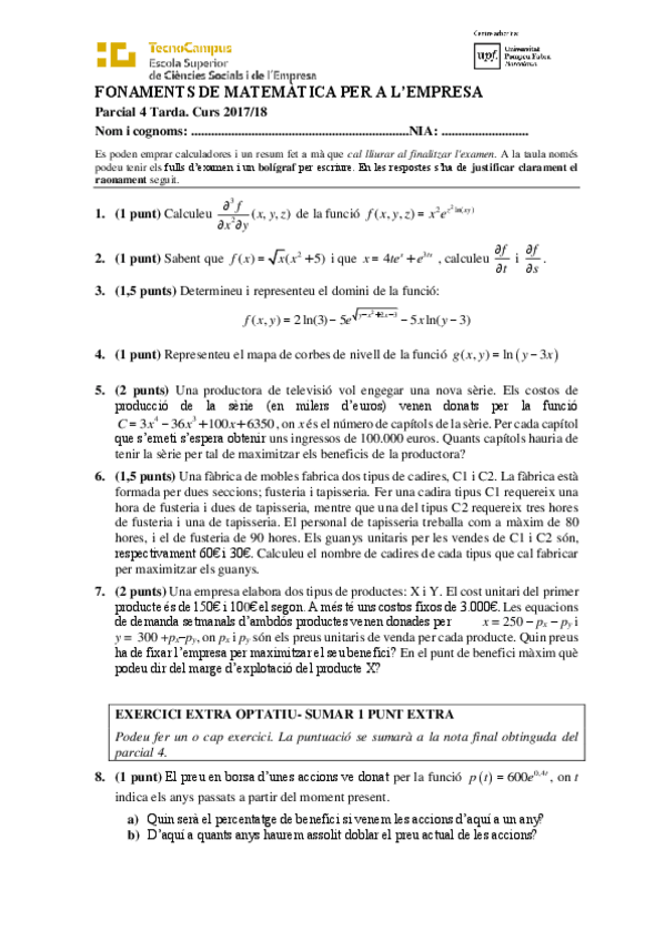 He publicado nuevos examenes de 1º Fonaments de Matemátiques per a L'empresa: Parcials i Finals