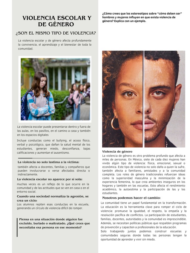 La violencia de género y la violencia escolar son dos tipos de violencia que se presentan con mucha frecuencia. Es importante conocer sus significados y sus principales características. Este cartel te ayuda a comprender mejor estos términos; además, inclu