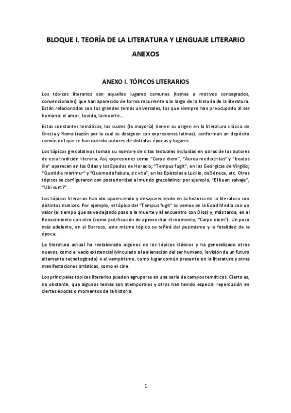 apuntes ANEXOS sobre el Bloque I: TEORÍA DE LA LITERATURA Y LENGUAJE LITERARIO ANEXOS