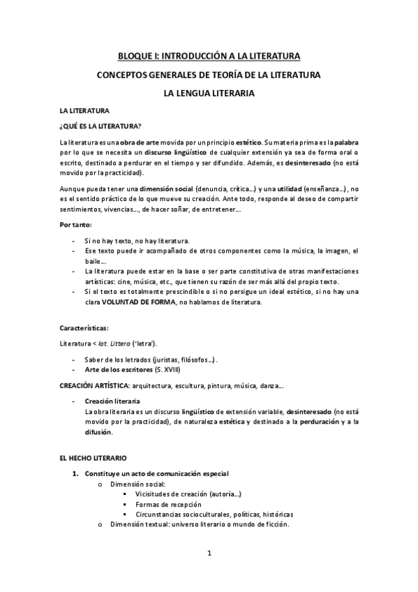 Apuntes sobre el bloque 1: INTRODUCCIÓN A LA LITERATURA CONCEPTOS GENERALES DE TEORÍA DE LA LITERATURA LA LENGUA LITERARIA