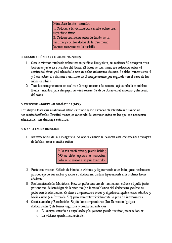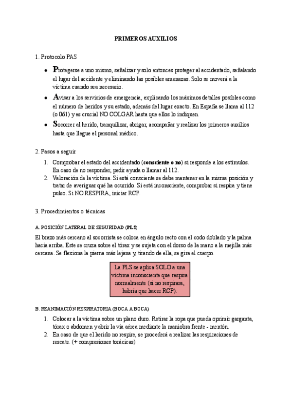 Contendio resumido sobre Primeros Auxilios. Incluye PSL, RP, RCP y Maniobra de Heimlich.