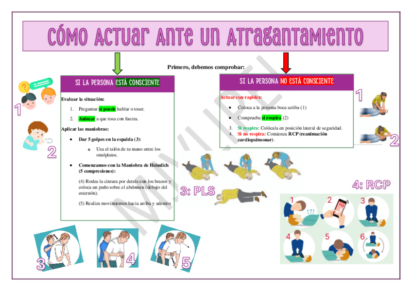 Contendio resumido sobre Primeros Auxilios. Incluye PSL, RP, RCP y Maniobra de Heimlich.