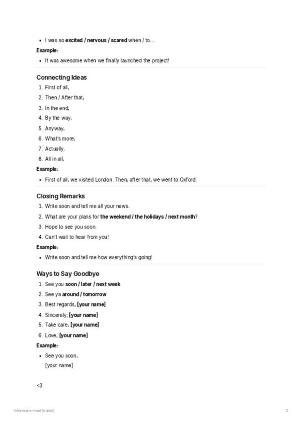 Apuntes de frases útiles en inglés para redactar correos informales y formales, organizada en secciones como saludos, introducción, desarrollo, conexión de ideas, cierre y despedidas.