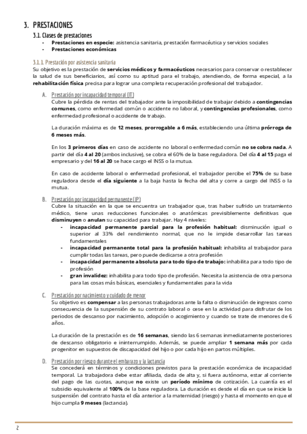 Tabla resumen de las prestaciones de la seguridad social y jubilación.