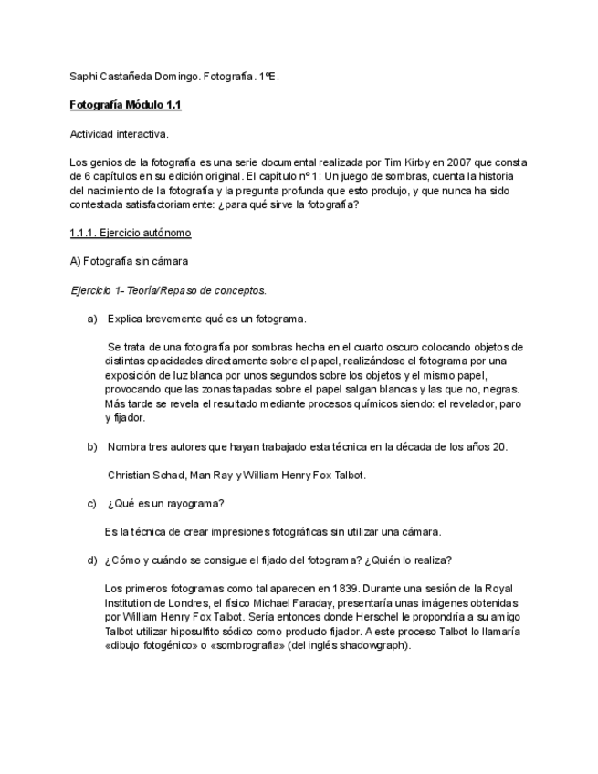 Módulo 1.1 de fotografía. Se trata de varios ejercicios relacionados con los principios de la fotografía de la profesora Aixa Portero. Igualmente, aunque no necesites resolver estas tareas, viene muy bien para estudiar ya que es muy completo.
