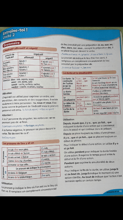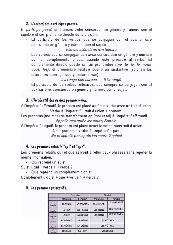 Francés, tiempos del pasado, imperativo de verbos pronominales, pronombres relativos, posesivos, discurso indirecto en presente y pasado, preposición incisa y vocabulario de la música.