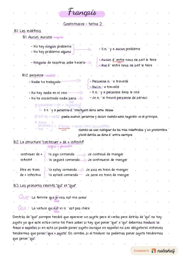 Francés, tiempos del pasado, imperativo de verbos pronominales, pronombres relativos, posesivos, discurso indirecto en presente y pasado, preposición incisa y vocabulario de la música.