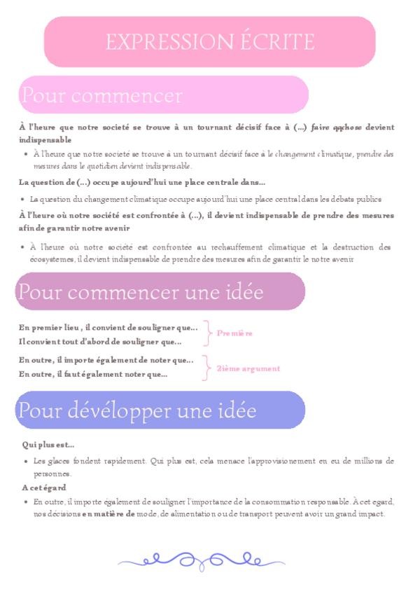 Frases y expresiones para la expresión escrita de 2º de Bachilletato en francés, orientada a la PAU. Contiene estructura y expresiones útiles con ejemplos