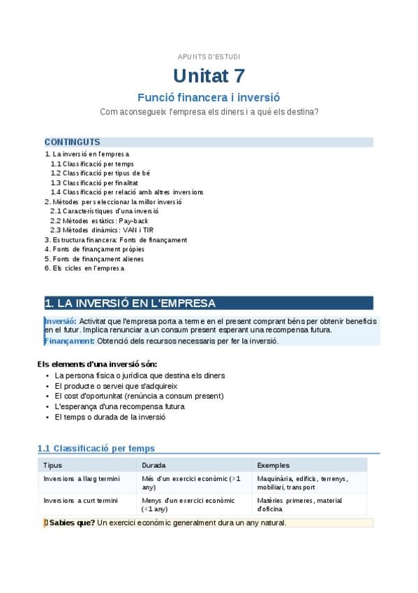 Aquí teniu uns apunts que engloben el tema 7 de Funció financera i inversió i que entra a selectivitat. Son de 2n de batxillerat. Son molt pràctics i recomanables.