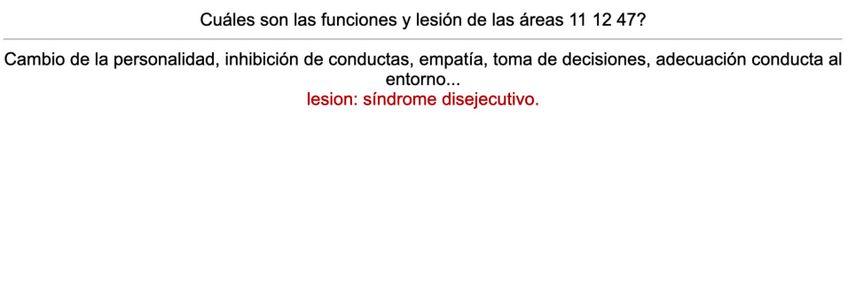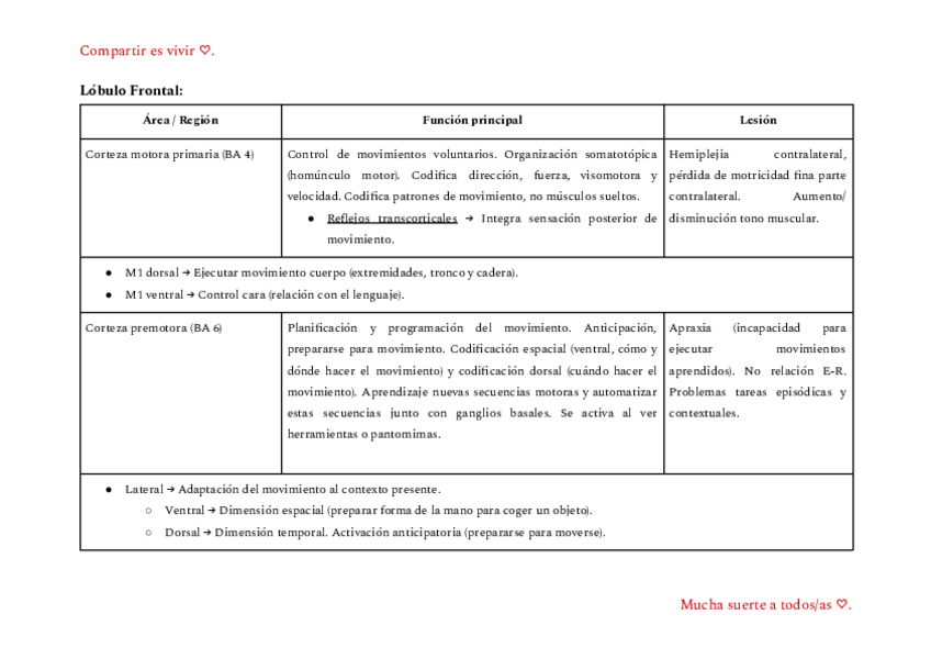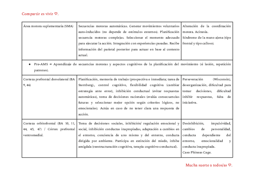 Tabla de áreas importantes, con sus funciones y sus lesiones. Mucha suerte ♡.