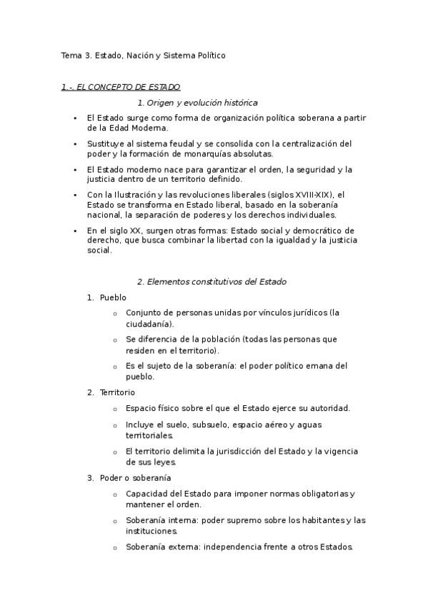 TEMA 3. ESTADO, NACIÓN y SISTEMA POLÍTICO. El concepto de Estado. Los modelos de Estado. La Nación. El sistema político: definición y componentes principales. Nación