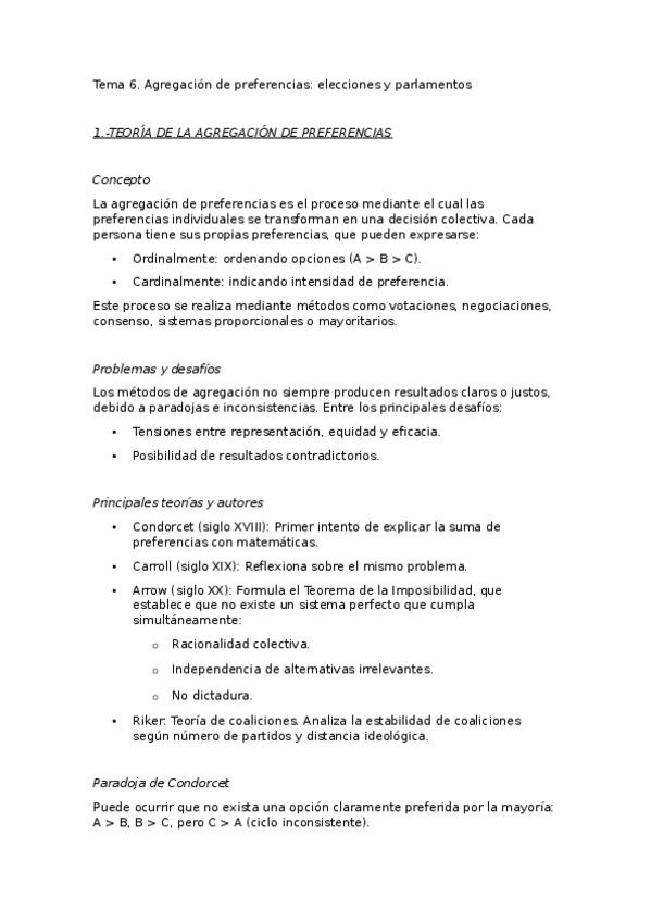 TEMA 6. AGREGACIÓN DE PREFERENCIAS El concepto de agregación de preferencias. Los problemas de agregación de preferencias. Autores básicos Tipos de agregación de preferencias. Elecciones y sistemas electorales. Los parlamentos y los procedimientos legisla