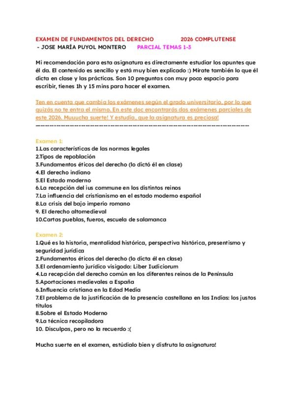 Examen Parcial Temas 1-3 Fundamentos del Derecho Moderno y Contemporáneo de Jose Maria Puyol, 2026