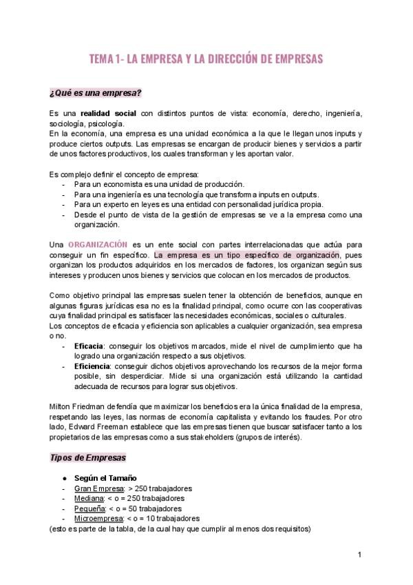 APUNTES COMPLETOS TEMA 1LA EMPRESA Y DIRECCIÓN DE EMPRESAS