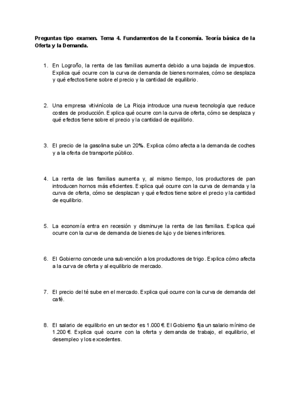 Ejercicios tipo examen tema 4 fundamentos de la economía. Oferta y Demanda.